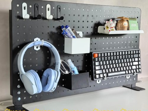 Với hệ thống lỗ tròn cách đều nhau, bạn có thể tự do lắp đặt các phụ kiện như móc treo, giá đỡ, hộp đựng để sắp xếp đồ đạc theo ý thích cá nhân. Đây là giải pháp lưu trữ theo chiều dọc, giúp giải phóng tối đa diện tích mặt bàn vốn dĩ hạn hẹp.