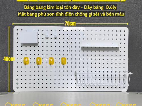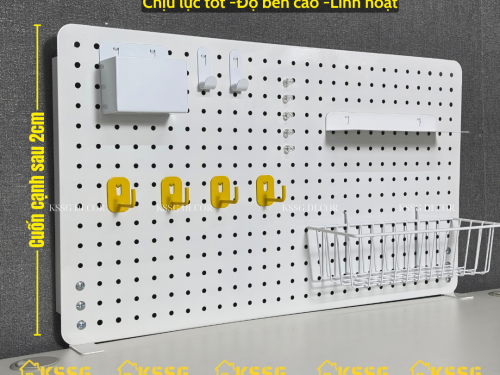 – Thông số bảng: bảng dày 0.6ly và mặt sau bảng có cuốn cạnh 2cm. Bảng được đục lỗ tròn, đường kính lỗ là 0,5cm và khoảng cách 2 lỗ tính từ tâm là 2.5cm.