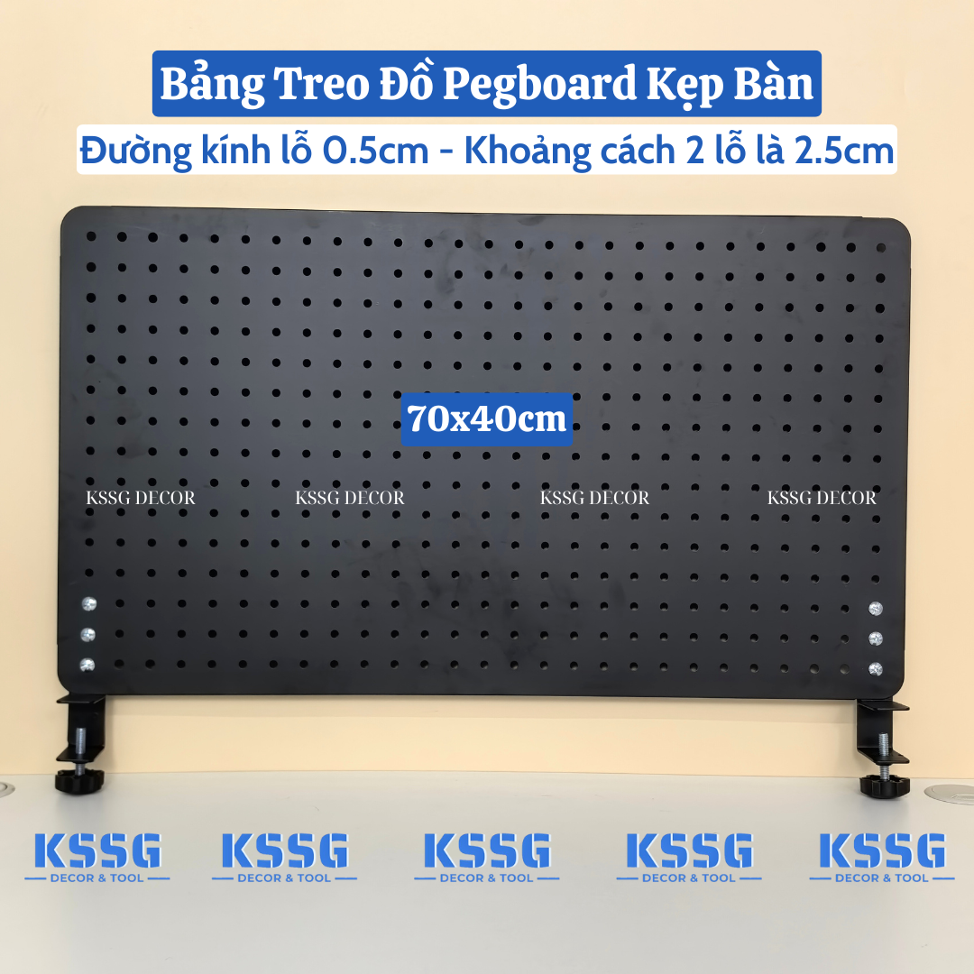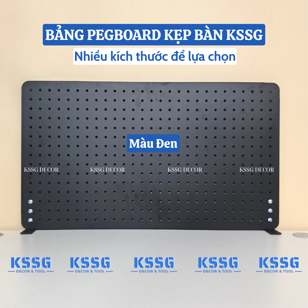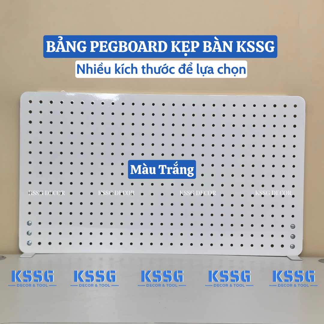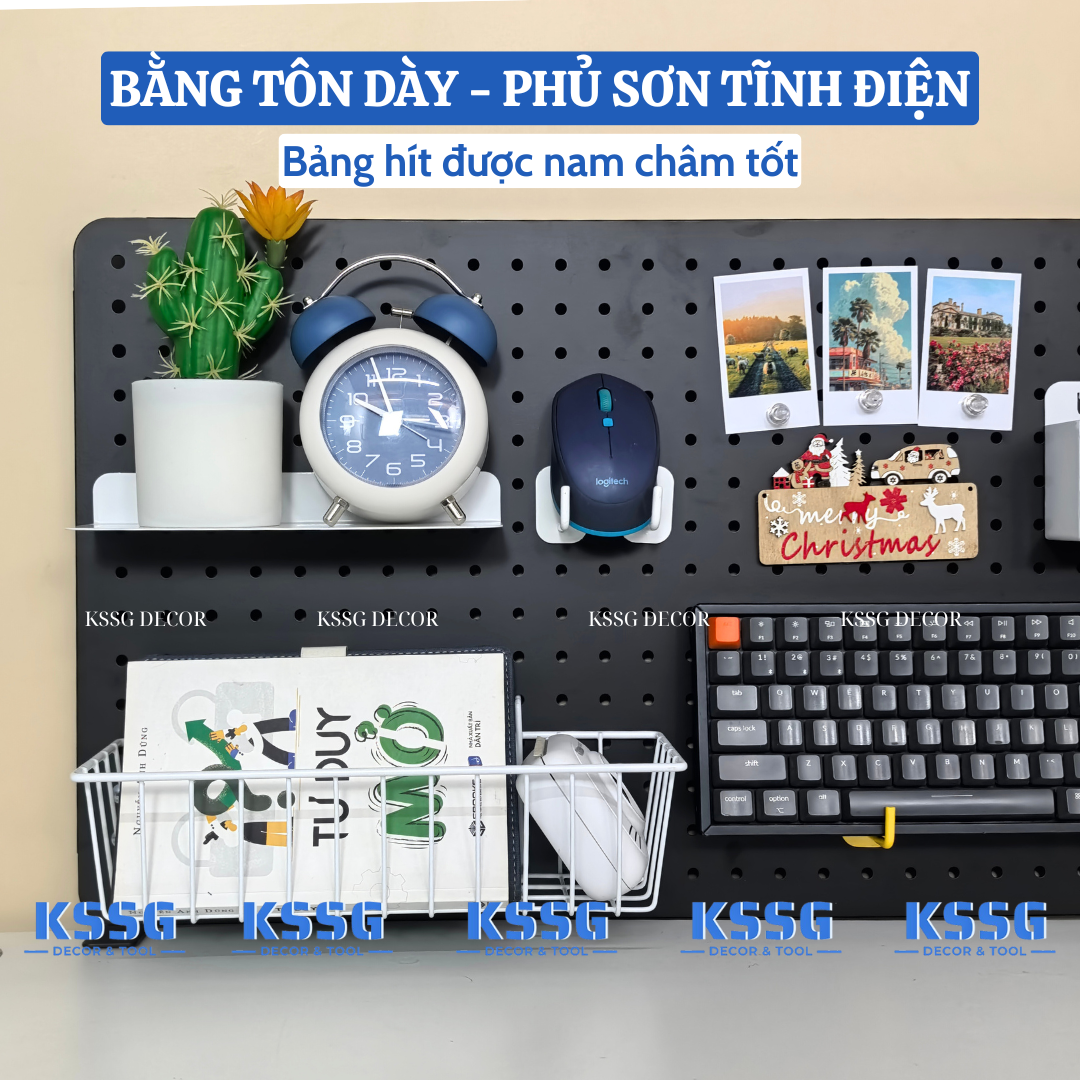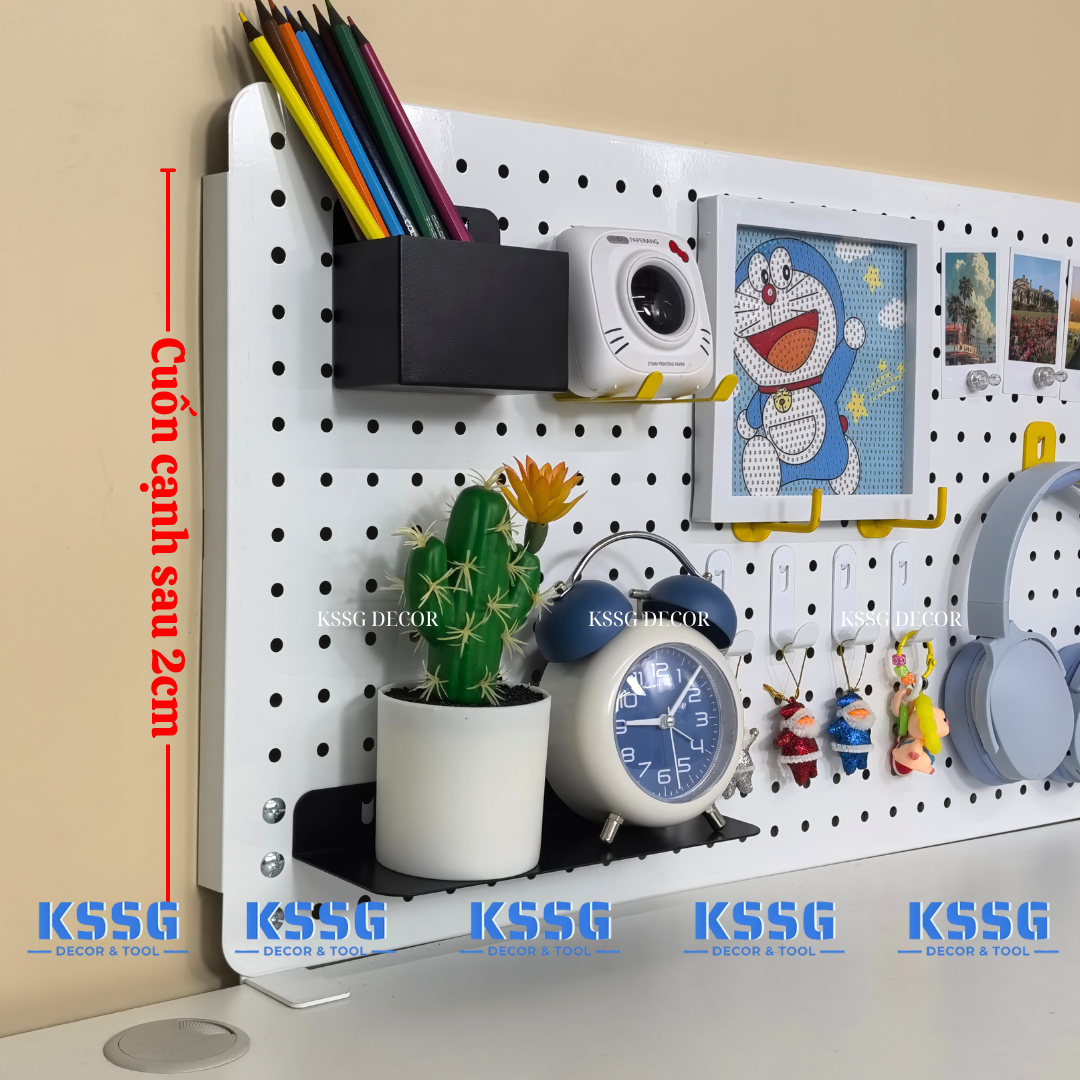 Khác với các dòng bảng nhựa dễ giòn gãy, bảng Pegboard kẹp bàn tại KSSG Decor được làm từ thép tấm dày 0.6ly. Toàn bộ bề mặt được phủ 3 lớp sơn tĩnh điện chống gỉ sét, chống bám bụi và cực kỳ mịn màng. Dù bạn treo các vật dụng nặng như máy ảnh, loa mini hay bảng vẽ điện tử, bảng vẫn giữ được độ phẳng, không hề rung lắc.