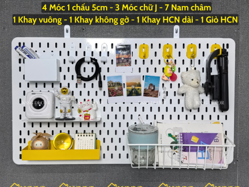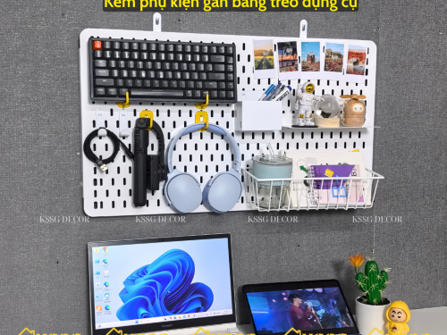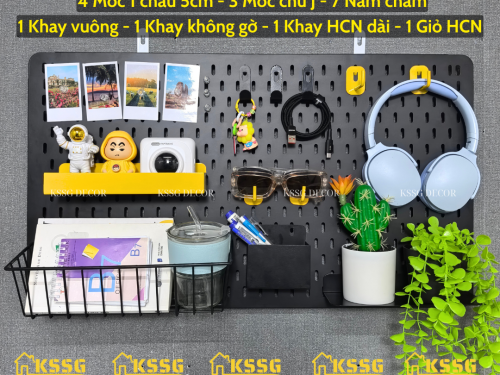 Combo Bảng Pegboard kèm phụ kiện gắn tường chính là giải pháp hoàn hảo để vừa trang trí không gian vừa tối ưu lưu trữ. Thay vì phải mua lẻ từng món, combo đã bao gồm bảng pegboard kim loại chắc chắn đi kèm đầy đủ móc treo, khay, rổ lưới – giúp bạn thoải mái sắp xếp đồ dùng học tập, phụ kiện cá nhân hay dụng cụ làm việc gọn gàng, ngay ngắn trên tường.