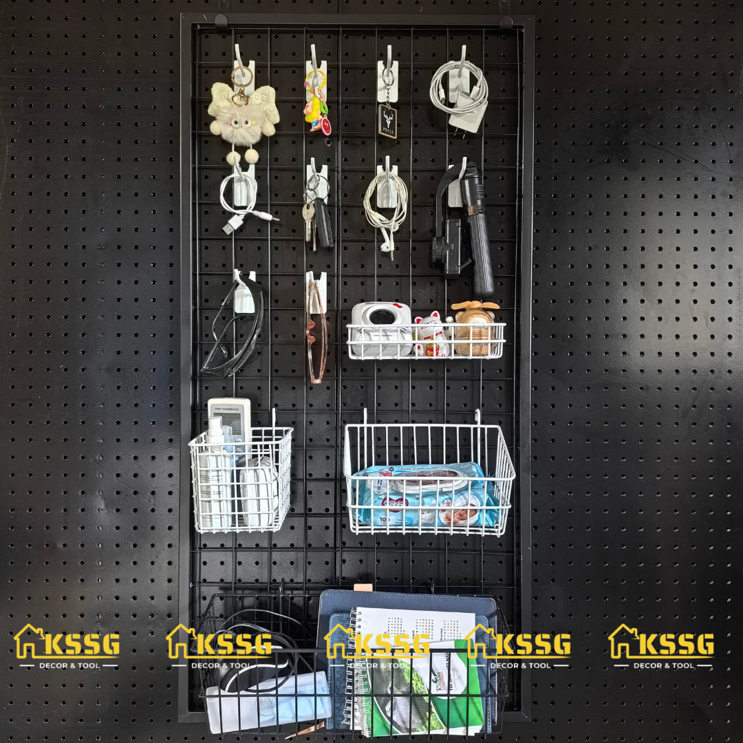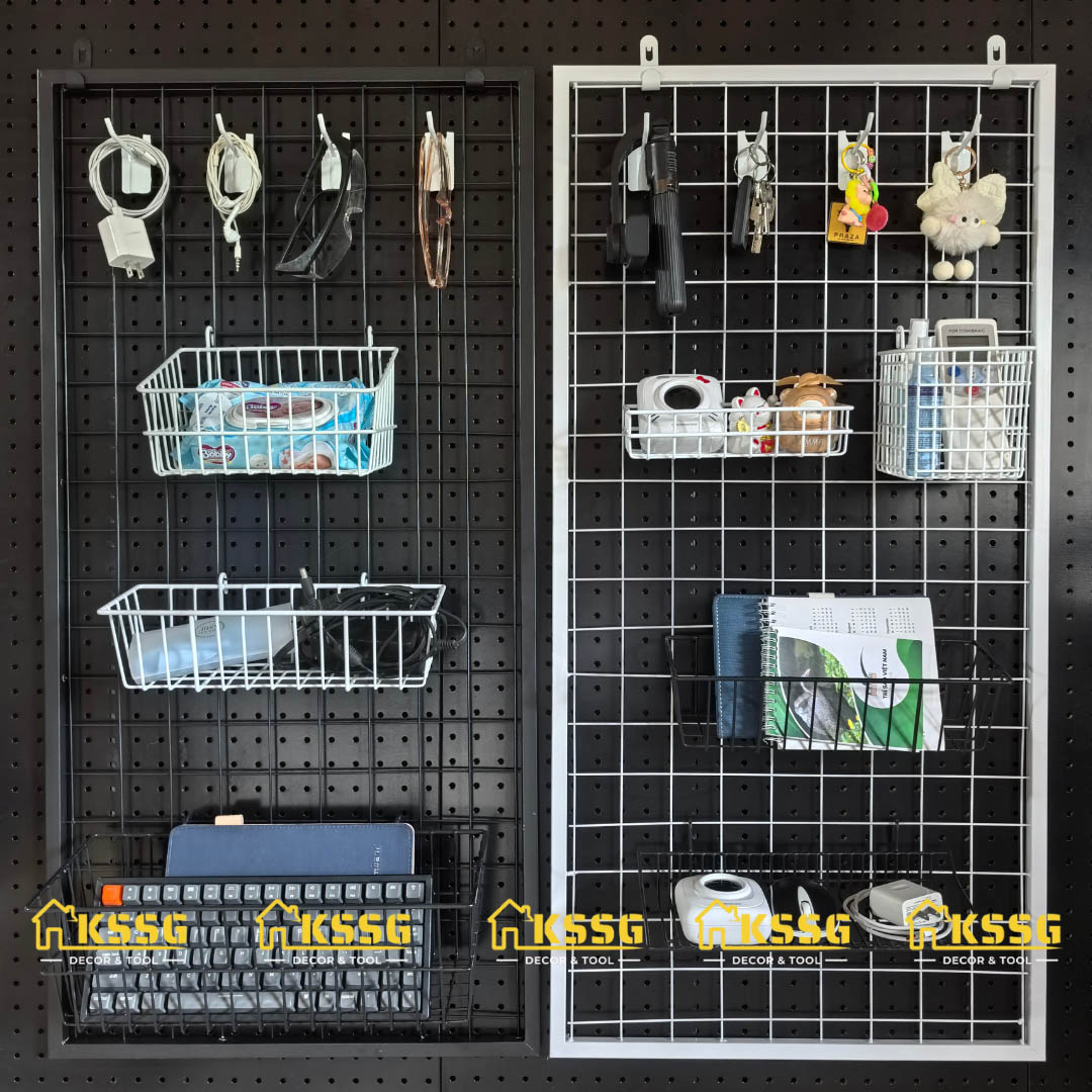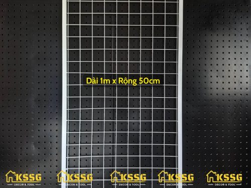 Khung lưới sắt ô vuông là dạng khung sắt hàn lưới hình vuông đều, được thiết kế để gắn trực tiếp lên tường nhằm treo phụ kiện, dụng cụ, đồ trang trí hoặc trưng bày sản phẩm.