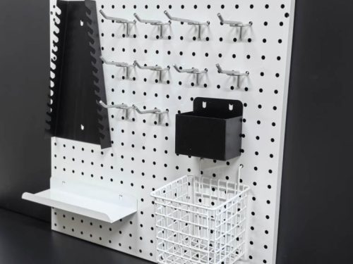 Điểm ăn tiền của tấm tôn đục lỗ chính là hệ phụ kiện đi kèm. Chỉ với một tấm bảng 50x50cm, bạn có thể biến hóa thành: