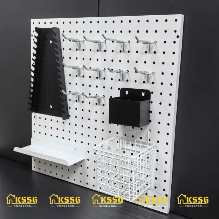 - Hệ sinh thái phụ kiện đa dạng: Cung cấp đầy đủ các loại móc gài, rổ, kệ tương thích hoàn toàn với hệ lỗ của bảng.
